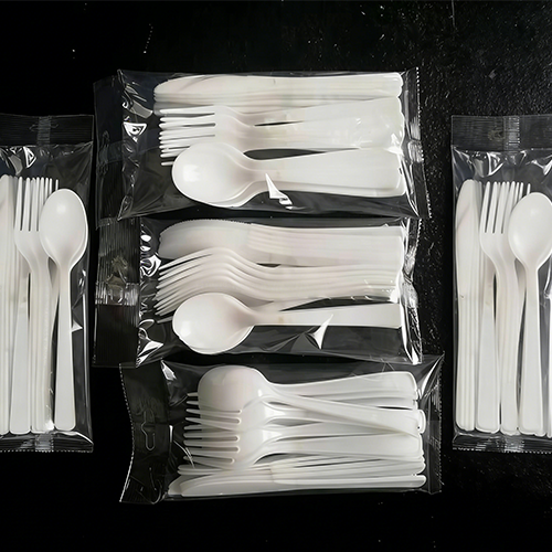 This system is suitable for all types of plastic cutlery, as it can easily adapt to different sizes and shapes of cutlery. Thanks to the robot arm's high level of programmability and flexibility, it can quickly adjust to a variety of packaging requirements, including the number of cutlery items per packet .